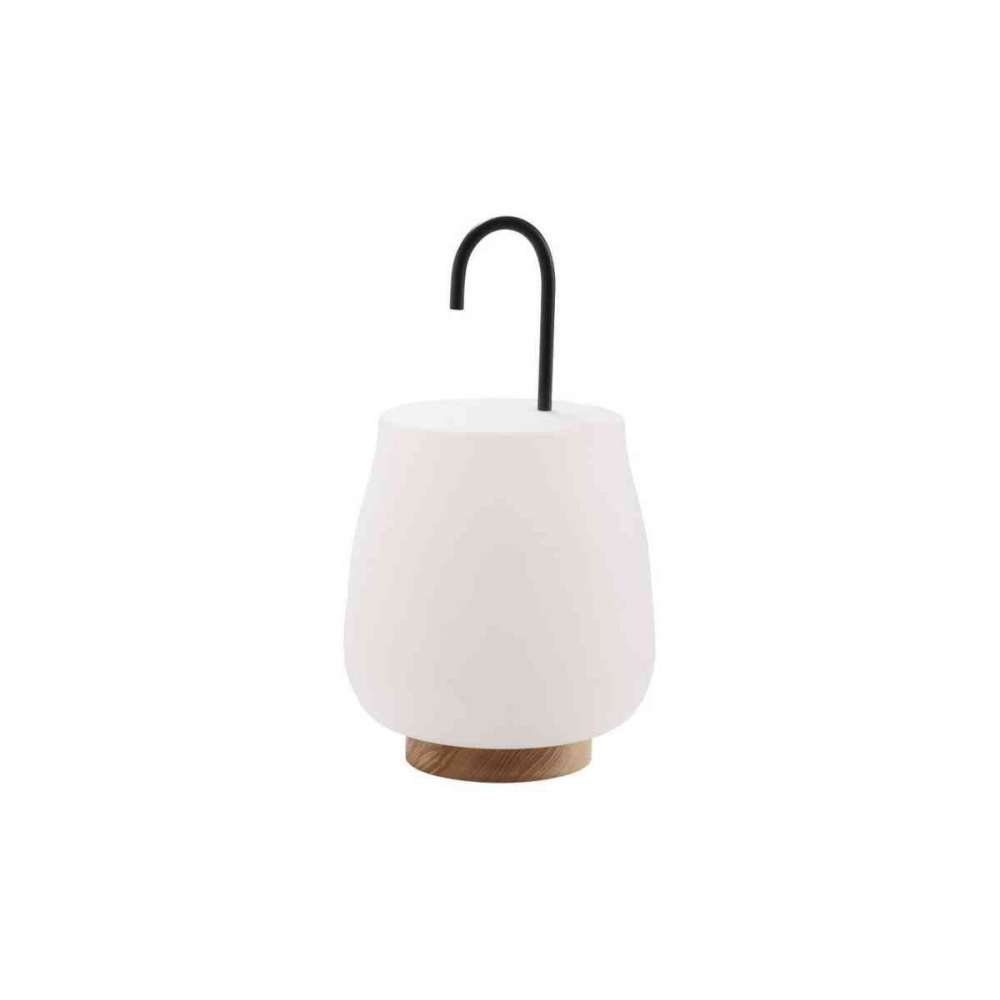 Przenośna lampa z piaskowanego, formowanego rotacyjnie polietylenu (PE) h 23 ø 22 cm, zwieńczona wygiętym stalowym uchwytem (solidna rura ø 10 mm), zabezpieczona do użytku na zewnątrz: galwanizowana galwanicznie + epoksydowa satynowa czarna farba. baza w olejowanym jesionie. Kabel neoprenowy w kolorze czarnym o długości 5 m. przełącznik ręczny jakości zewnętrznej. dostarczana z 1 żarówką led 10 we 27, temperatura barwowa 4000 K (zimna biel), 820 lumenów, stopień ochrony ip 55.
