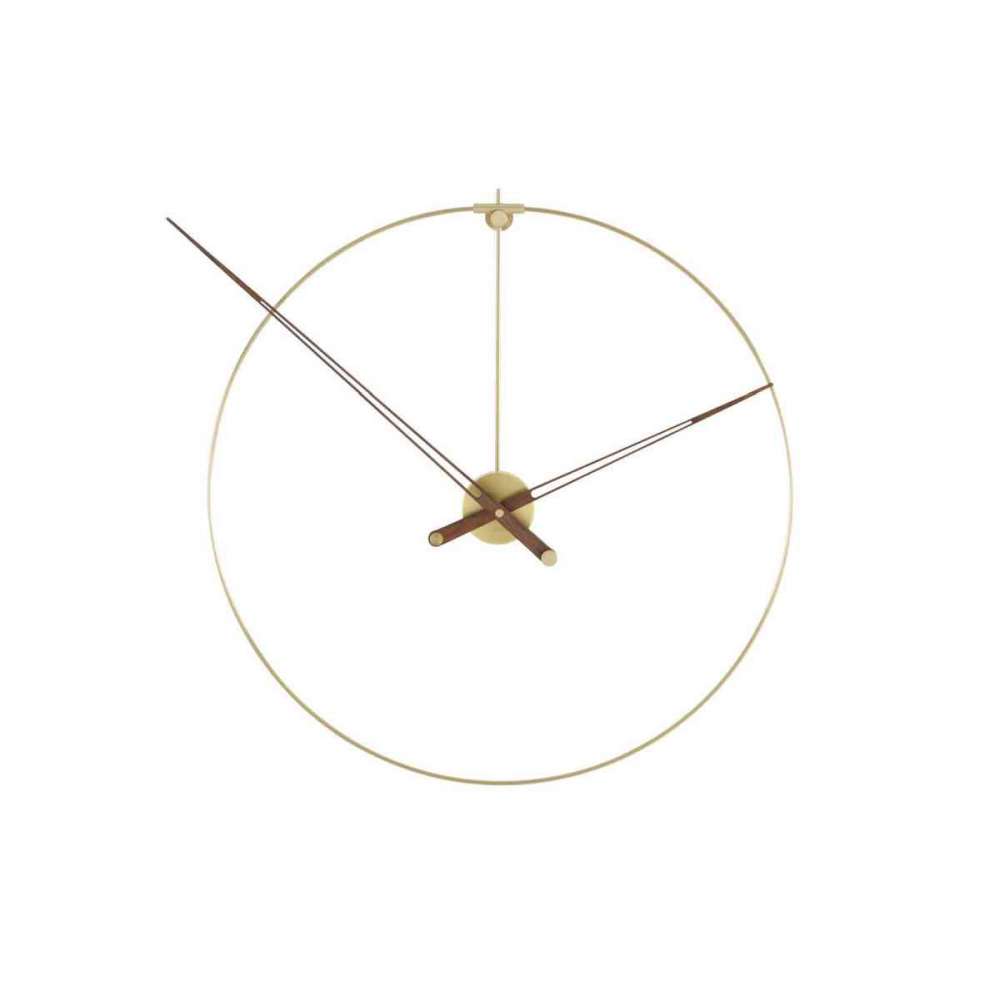 zegar ścienny wykonany z bezbarwnego lakierowanego polerowanego mosiądzu z orzechowymi uchwytami