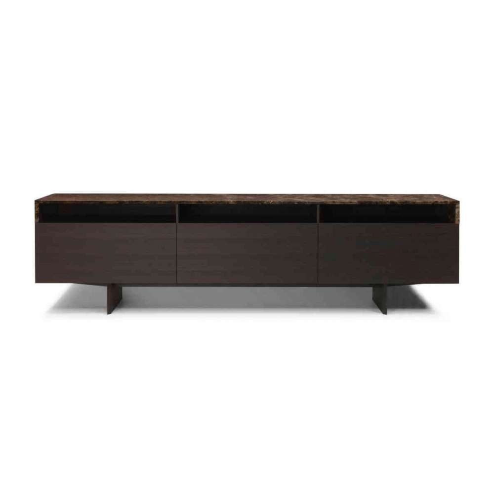 Regularna i czysta objętość, z poddaną obróbce termicznej strukturą dębową, wyposażoną w otwarte szafki na górze i na dole, zamknięte drzwiami klapowymi i szufladami, wsparte na eleganckich nóżkach z lamy z tego samego materiału. Kontrastując z ciepłym drewnem, szlachetny cementowy blat obraca się wokół rogów, tworząc wyrafinowany łuk.