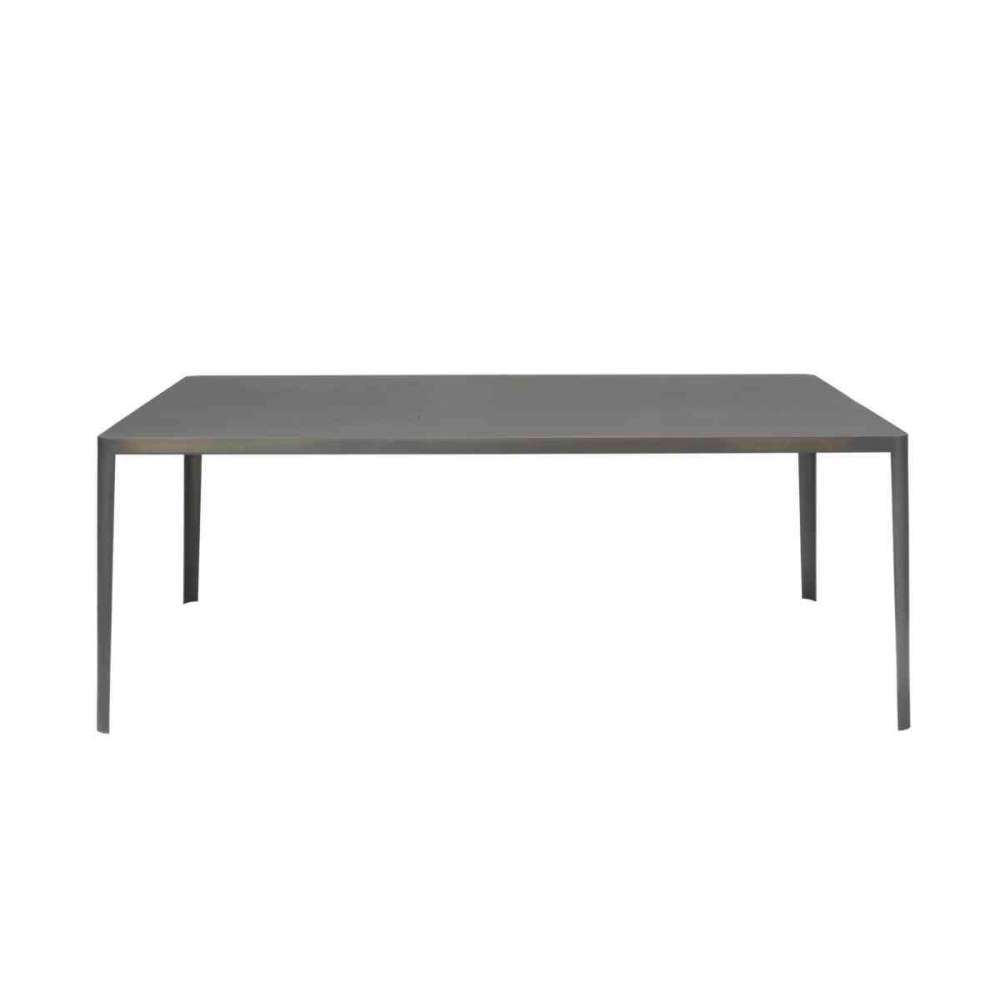 Rygorystyczne i eleganckie wzornictwo stołu wykonanego z cienkich stalowych nóg przyspawanych do ramy z tego samego materiału. W ramach tej ramy górna warstwa z lakierowanego szkła lub cementu dopełnia rzeźbiarską i hieratyczną linię tego dzieła. 140 x gł.140 x wys.73