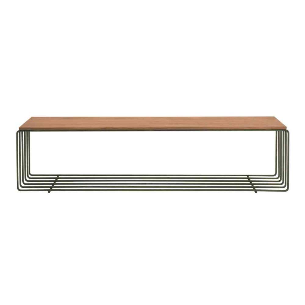 Mebel przeznaczony zarówno do siedzenia, jak i stolika wejściowego. Jego lekka i wyrafinowana konstrukcja, pasująca do ciągłej ramy szkieletowej z prętów stalowych poddanych obróbce z listwami z litego orzecha włoskiego Canaletto na blacie, czyni go wyjątkowym elementem wyposażenia każdego salonu, z nowymi sofami i stolikami, a także sypialni. Akcesorium wyróżniające się podstawowymi liniami, czerpiące korzyści z kontrastu między naturalnym drewnem a metalem poddanym obróbce przemysłowej.