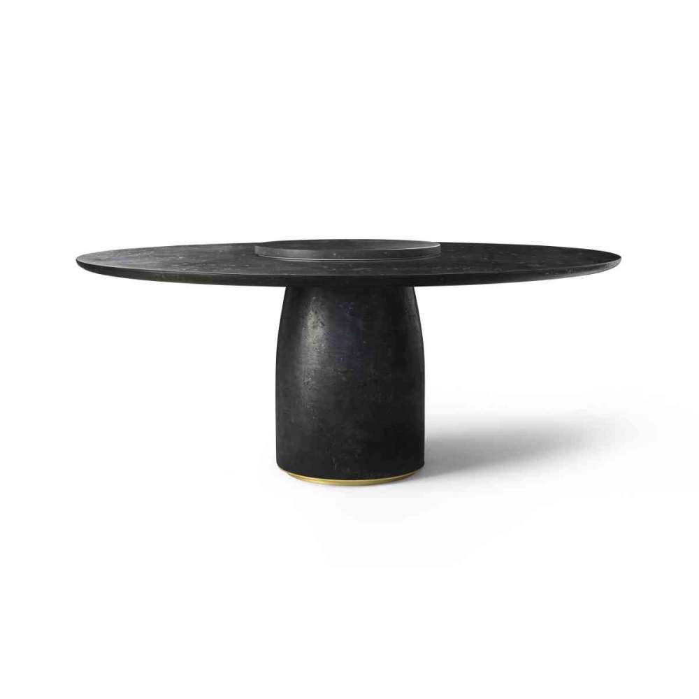 Dzięki swoim harmonijnym i stylistycznie hojnym formom BULÈ wyróżnia się blatem i centralną, strukturalną podstawą wykonaną w wyrafinowanym i przyjemnym w dotyku wykończeniu Nero Belgian Blue, które naśladuje charakterystyczne cechy szlachetnego marmuru o tej samej nazwie. Podstawa została wzmocniona metalową listwą pokrytą brązem. Stół występuje w dwóch różnych rozmiarach: 1800/2000x735 mm. Taca obrotowa: 700/900x25 mm (Øxh).