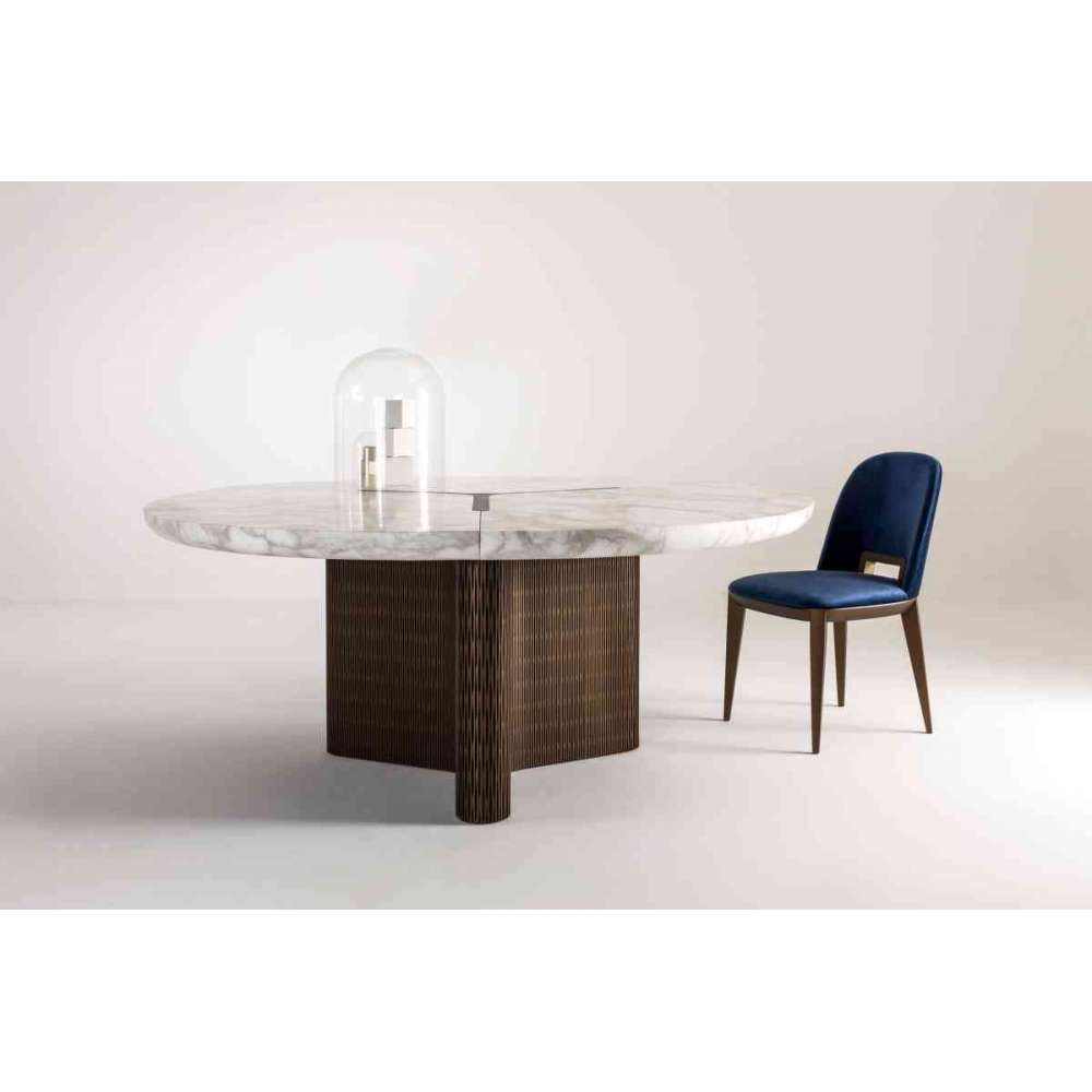 Zestaw stołów modułowych, dostępnych w wersji okrągłej, kwadratowej i prostokątnej, z marmurowym, gładkim lub lakierowanym blatem drewnianym, również z pojedynczym segmentem z marmuru lub drewna. Intarsje z oksydowanego mosiądzu, krawędź z litego drewna gr. 7 cm i charakterystyczne perforowane lakierowane drewniane nogi z brązu. .75