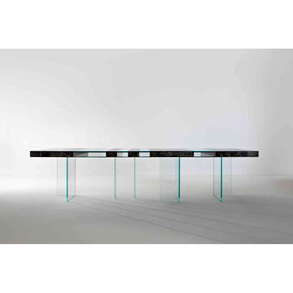 Modułowy prostokątny stół ze szklanym i marmurowym blatem, wsparty na szklanych podstawach, które można powiększać, dodając kolejne moduły i witryny ze szkła lub marmuru.