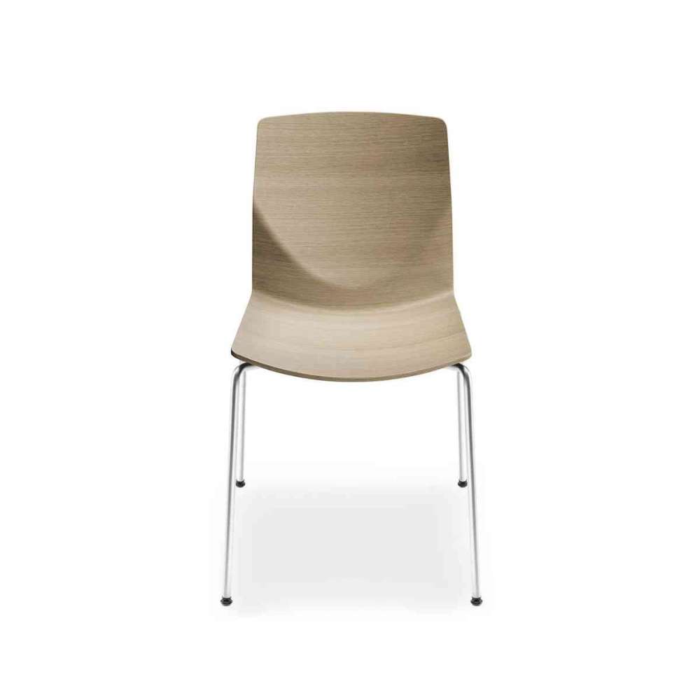 Krzesło z możliwością sztaplowania z piaskowaną ramą ze stali nierdzewnej i siedziskiem z zakrzywionej sklejki ze skórzaną poduszką. W przypadku układania w stos sugerujemy zabezpieczenie skórzanej poduszki.