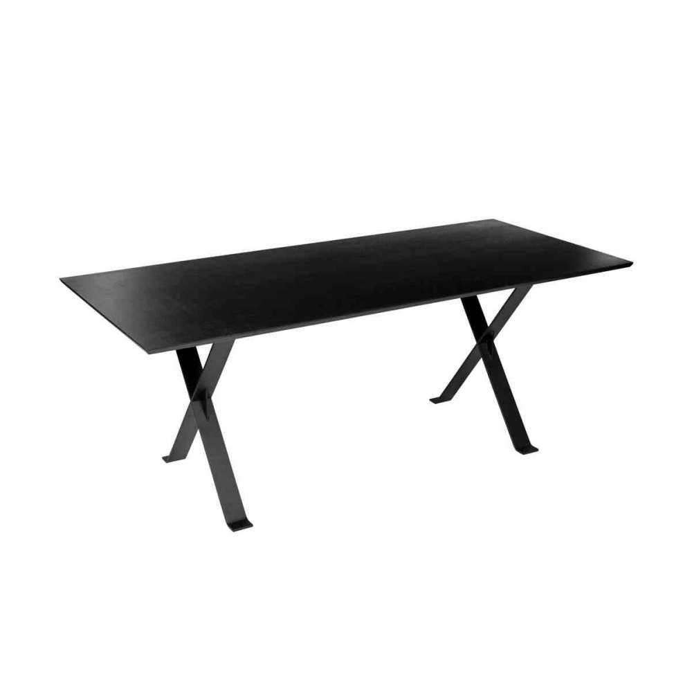 Doskonały ponadczasowy design i wysoki poziom domowego komfortu łączą się w doskonałej jedności ze stołem Stanley. Przy stole jadalnym STANLEY wygodnie usiądzie do 8 osób. Jego skrzyżowane nogi są ustawione w taki sposób, że jest dużo miejsca zarówno na krzesła, jak i nogi. Nawet krzesła do jadalni z wysokimi podłokietnikami można dosunąć do stołu, aby zaoszczędzić miejsce. Blat pokryty jest surowo ciętym fornirem, który jest bejcowany na kruczoczarny kolor i połączony z kutą ramą. Fascynująca, żywa faktura drewnianej powierzchni tworzy trójwymiarowy wygląd i wyjątkowe wrażenia dotykowe. Walcowane na gorąco stalowe sekcje ze staroświeckimi połączeniami śrubowymi i spawanymi zapewniają wysoką stabilność, podkreślając celowo ręczny wygląd. Drewniana powierzchnia jest bejcowana na czarno z półmatowym wykończeniem. Wilgoć plami drewno, a słoje należy zawsze natychmiast wycierać. Stół należy od czasu do czasu potraktować wysokiej jakości środkiem do polerowania mebli.