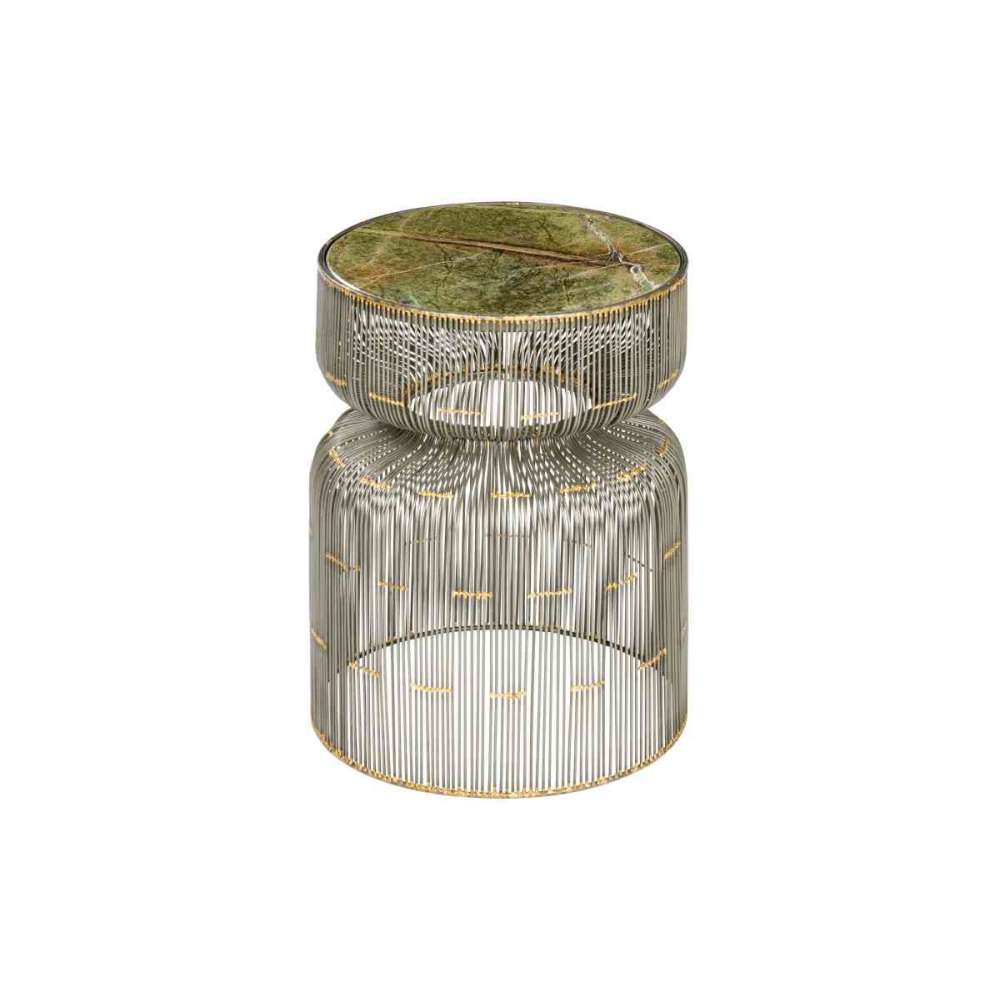 Stolik boczny: Ten mały stolik boczny to arcydzieło jednego z naszych najlepszych producentów. Ze skrupulatną dbałością o szczegóły solidne żelazne druty są lutowane razem, tworząc każdy mebel. Kawałki drutu są mocowane jeden po drugim mosiężnym lutem w celowo organiczny, nieregularny wzór. Nad każdym pojedynczym dziełem sztuki pracuje jednocześnie do trzech rzemieślników przez kilka dni. Drut metalowy pokryty jest ciemnym cynkiem i wykończony ochronną powłoką bezbarwnego lakieru. Blat wykonany jest z tak zwanego marmuru z lasu deszczowego, który ma przecinające się żyłki w żywych odcieniach zieleni. Marmur z tymi niezwykle pięknymi wariantami kolorystycznymi występuje tylko w północnych Indiach. Jest to produkt naturalny z unikalnymi żyłkami i wariantami kolorystycznymi, które są różne w każdym egzemplarzu. Nikaho to dekoracyjny stolik boczny, który dzięki ekstrawaganckiemu designowi dopełni każdy styl życia. Ponieważ marmur i inne kamienie naturalne są wrażliwe na substancje kwaśne, rozlane wino lub sosy i inne tego typu płyny należy zawsze natychmiast wycierać. Do pielęgnacji blatu należy używać środków zalecanych do marmuru.