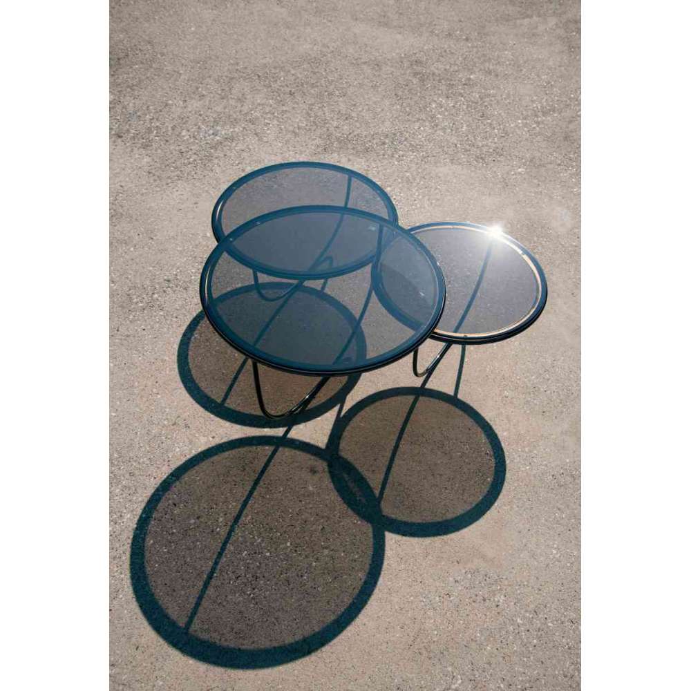 Zaprojektowany przez Oki Sato, Nendo. Na pierwszy rzut oka Trio to stolik boczny, który składa się z trzech nachodzących na siebie przezroczystych misek. Otwór każdej miski jest przykryty szklanym, metalowym lub drewnianym blatem. Kształt misy sugeruje pojedyncza zakrzywiona linia — pozornie spektakularny wyczyn równowagi, ale wynik jest zaskakująco stabilny, a każdy kształt jest przymocowany do drugiego w dwóch różnych punktach. Ta jednonożna konstrukcja obsługuje kilka blatów, co kontrastuje z bardziej tradycyjnymi konstrukcjami stołów.