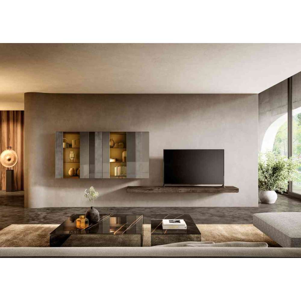 Jasna, współczesna ściana do salonu z wyrafinowanymi detalami. Eleganckie regały z grafiką pomogą Ci wyeksponować cenne przedmioty dzięki innowacyjnemu wykonaniu, które wykorzystuje nieodłączne właściwości szkła. Pływające wzory, wyrafinowane przezroczyste efekty, teksturowane wykończenia i wbudowane oświetlenie zostały połączone razem, aby zaoferować różnorodne kreatywne sposoby umeblowania Twojego salonu.