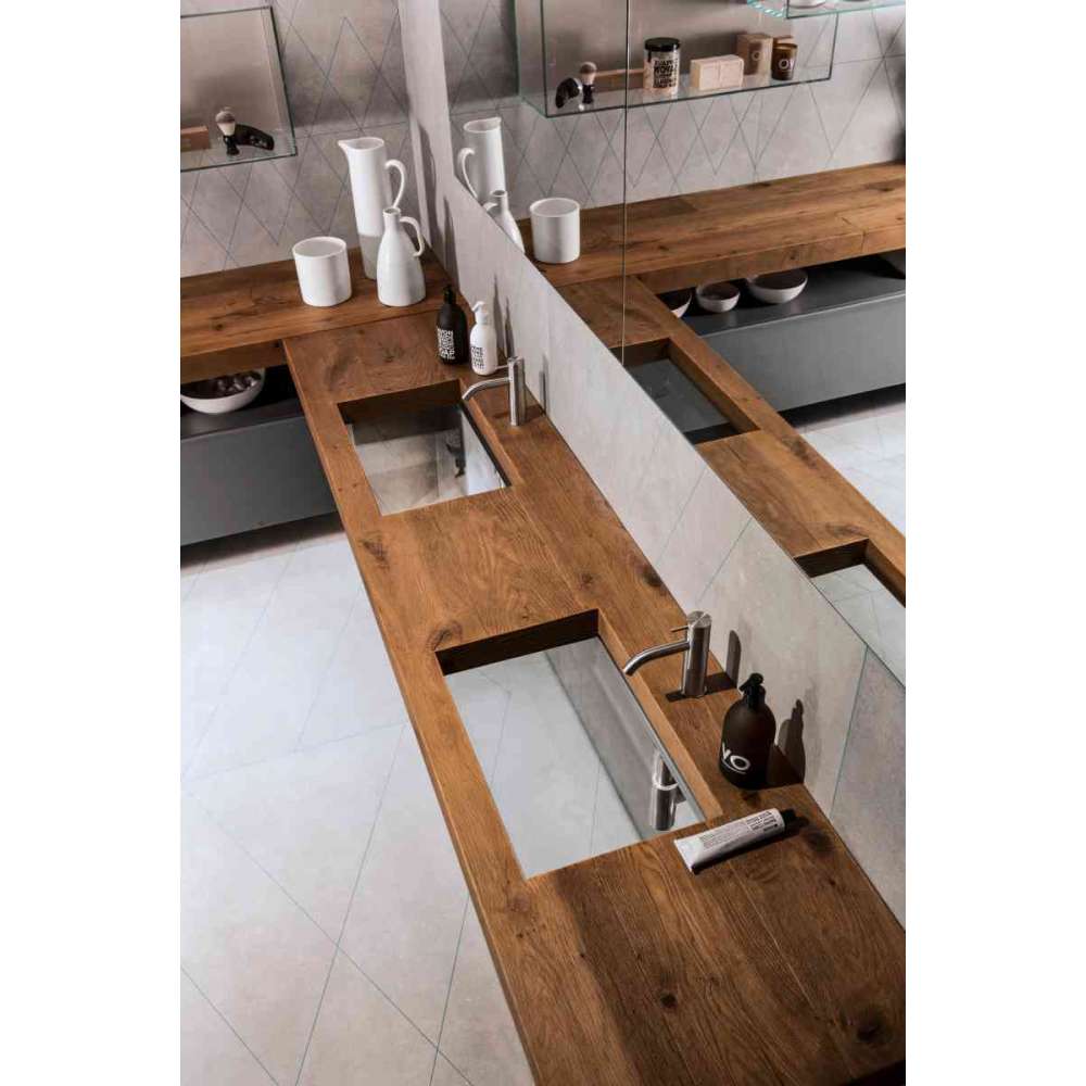 Przezroczyste okno wodne utworzone z półki o grubości 8 cm. Umywalka Depth igra z uczuciem pustej, otwartej pustki z nachylonym dnem z przezroczystego szkła. Wildwood, wykonane z wielowiekowego dębu o rzeźbionym usłojeniu, doskonale dopasowuje się do przestrzeni i tworzy elegancką powierzchnię. Materiał został poddany obróbce cieplnej, dzięki czemu jest wysoce odporny na płyny w celu ponownego utrwalenia.