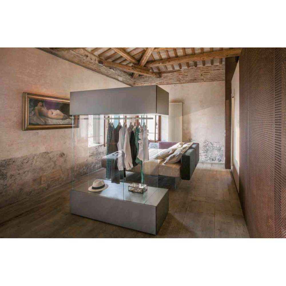 Air Szafa odnawia i przekształca tradycyjny wieszak na ubrania dzięki zawieszeniu na niewidocznych płytach wykonanych z hartowanego, bardzo jasnego szkła. Samodzielna i idealna do każdej przestrzeni, ta szafa wydaje się zawieszona w powietrzu i daje scenograficzny efekt lekkości.