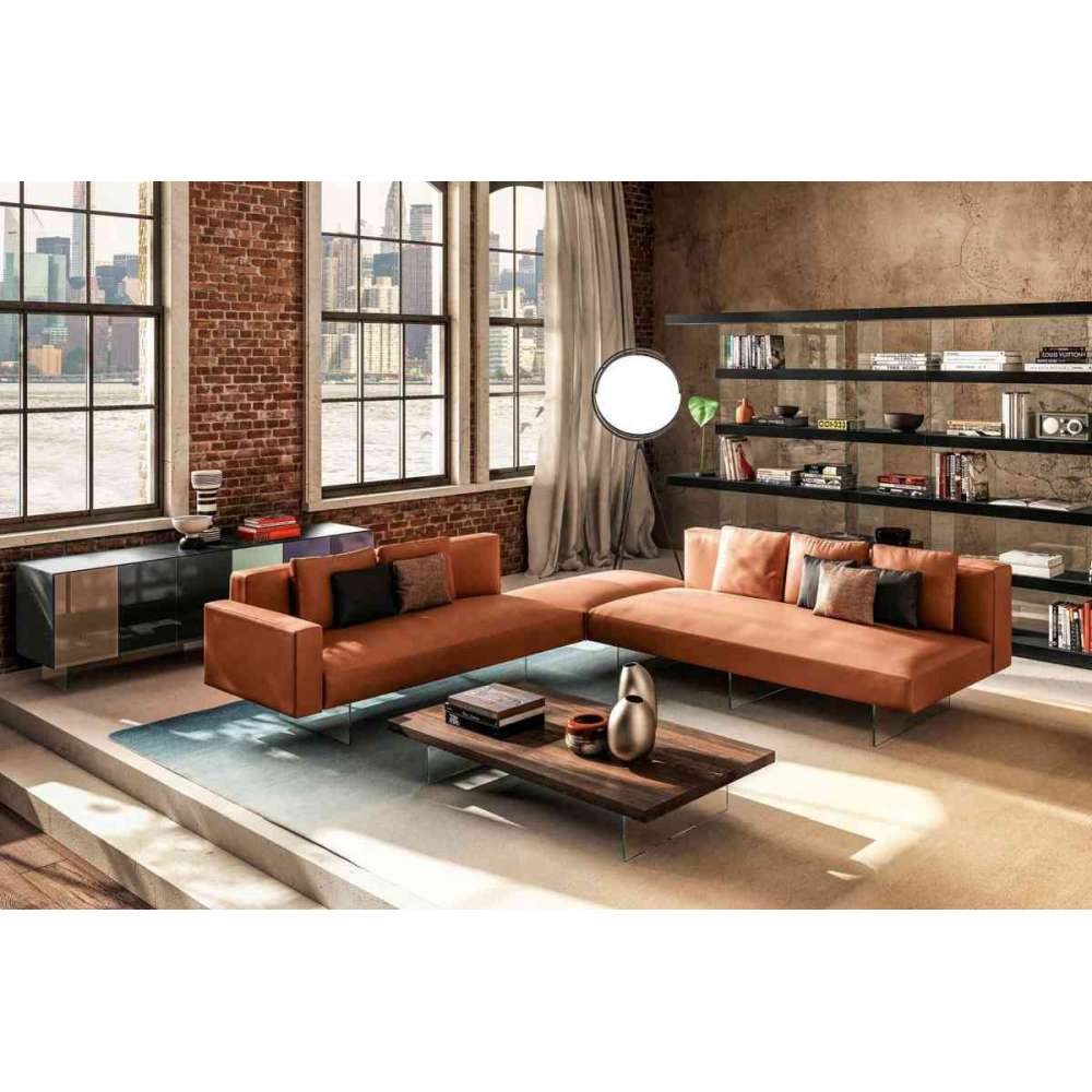 Prostokątne lub okrągłe, wyraziste materiały blatu i zaskakujące zawieszenie na wyjątkowo przejrzystych szklanych nogach.