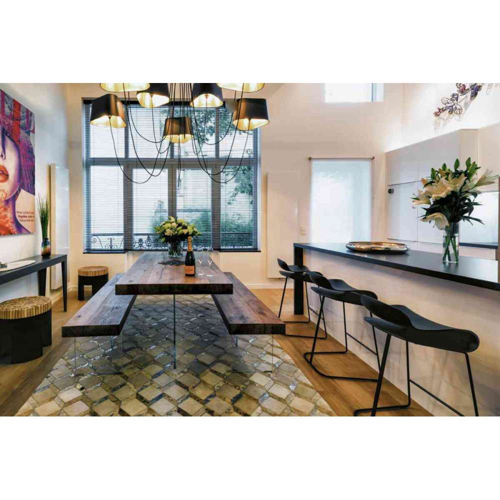 Dębowa ławka wsparta na przezroczystych nogach z bardzo jasnego szkła: ławka Air wydaje się unosić w powietrzu, nadając przestrzeni lekkości. Drewniane siedzisko o grubości 8 cm występuje w dwóch wariantach: jeden z całkowicie zamkniętymi końcami, drugi z zagłębionymi końcami dostosowanymi do barwionego szkła.