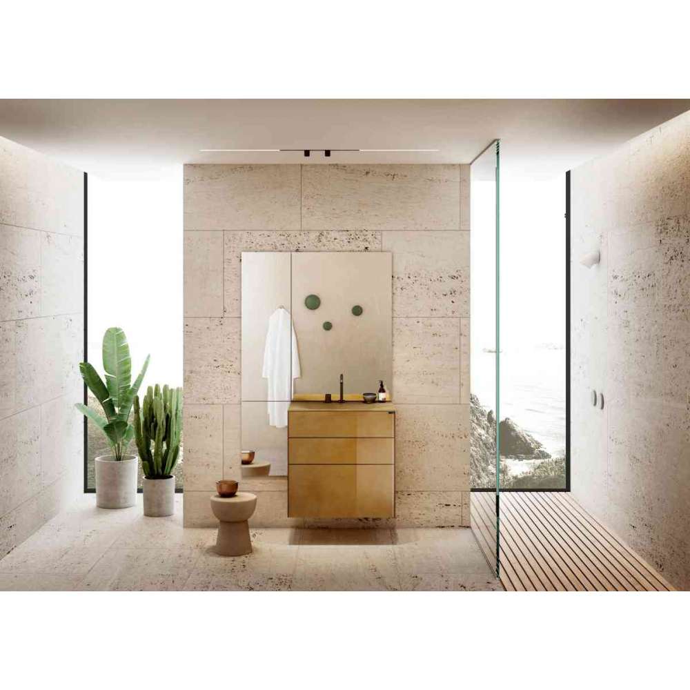 Szklany blat został poddany obróbce cieplnej, aby stworzyć praktyczną, zakrzywioną umywalkę, wbudowaną w szafki dolne 36e8. Zapewnia to wszechstronną przestrzeń do przechowywania i pozwala zaprojektować przestrzeń w różnych wykończeniach i rozmiarach. Szkło można stopić i uformować, aby stworzyć umywalkę o idealnym rozmiarze dla szafki, w którą zostanie wbudowana. Jest dostępny we wszystkich kolorach LAGO i wykończeniach Metal XGlass.