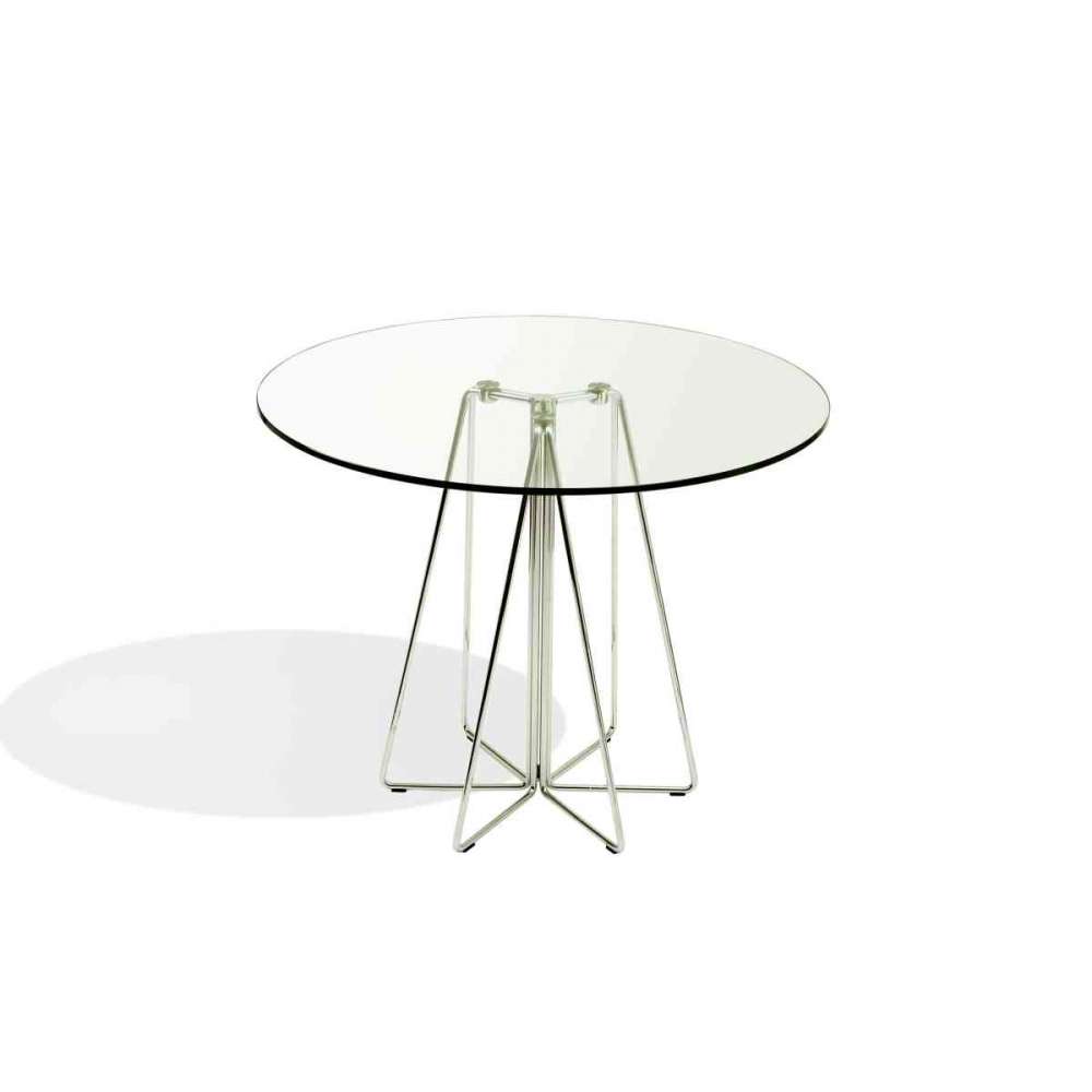 Dostępny z blatem z kamienia akrylowego lub szkła, w tym wersje okrągłe w zakresie średnic, stół ma podstawę z czarną lub białą powłoką Rilsan. Kamień akrylowy na blat to solidny materiał złożony z wodorotlenku glinu, żywicy akrylowej i naturalnych pigmentów. Wodorotlenek glinu sprawia, że produkt jest bardzo trwały, a żywica akrylowa zapewnia odporność na wodę i trwałość koloru w czasie, ułatwiając czyszczenie i usuwanie plam po jedzeniu i napojach.