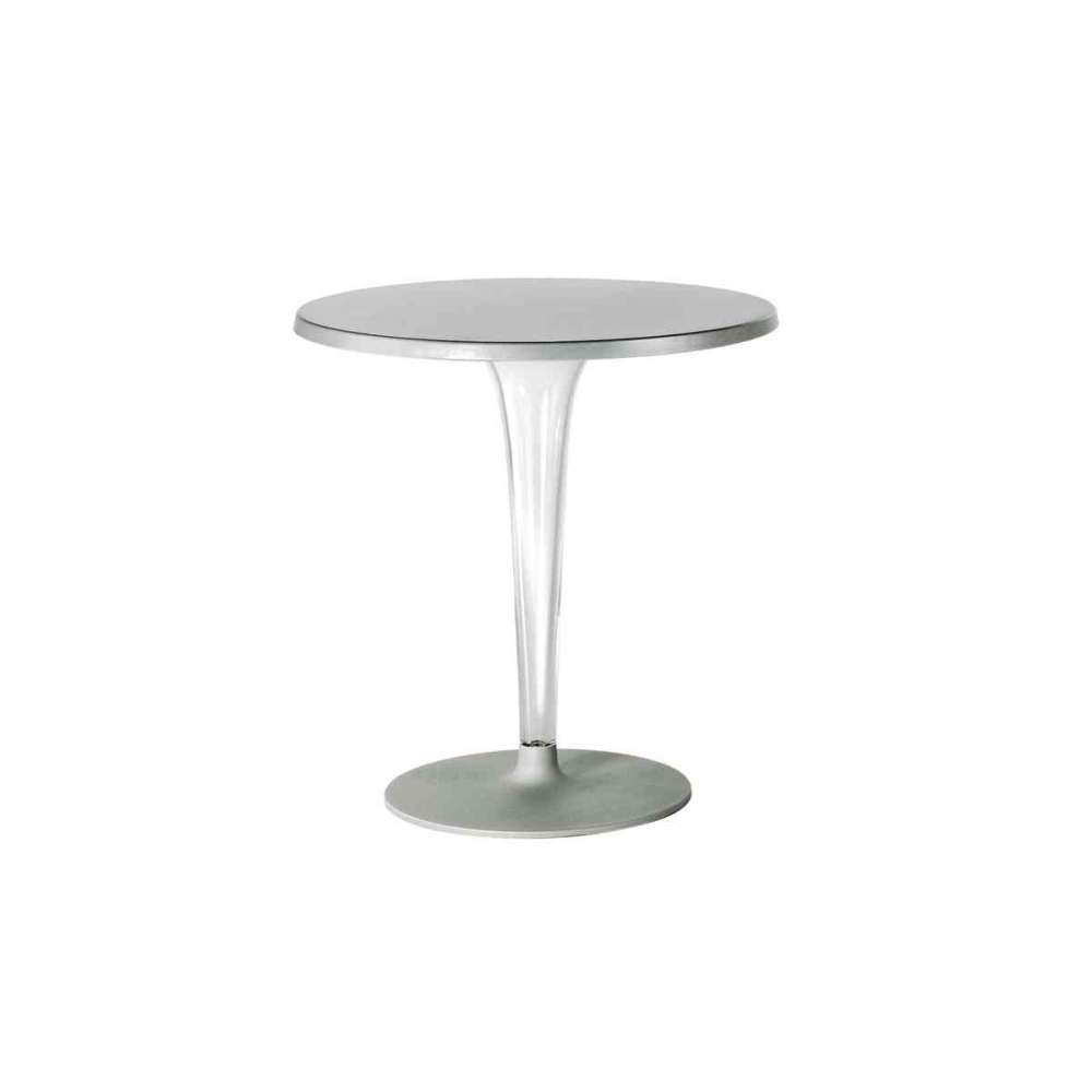 Stoły TopTop występują w wersji stworzonej specjalnie do użytku biurowego, odpornej na wstrząsy i warunki atmosferyczne. Przezroczyste nogi o przekroju okrągłym lub kwadratowym mają fasetowaną powierzchnię, metalowy rdzeń i blat z melaminy i są dostępne w różnych kolorach – białym, czarnym, aluminiowym i zielonym, a podstawa jest malowana aluminium.
