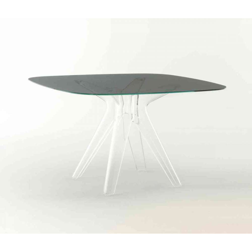 Stół w wielu wariantach kolorystycznych, który stanowi kolejny krok naprzód w innowacyjnym wykorzystaniu poliwęglanu. Centralna podstawa, wyprodukowana z tworzywa sztucznego z formą o podwyższonej innowacyjności technologicznej, zapewnia wydajność i stabilność wspierającą szklany blat. Baza dostępna jest w 3 odcieniach (bezbarwny, pudrowy róż i fumé) i można ją połączyć z jednym z 5 topów w wariantach kolorystycznych brązu, pudrowego różu, przydymionego, zielonego i żółtego, co daje 15 możliwych kombinacji kolorystycznych.