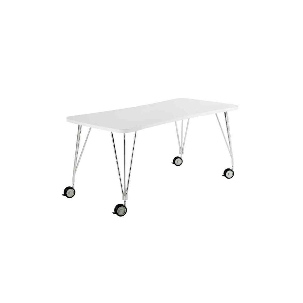 Ten stół do nauki powstał z myślą o biurze. Delikatny kształt klepsydry sprawia, że Max pasuje zarówno do stołów tego samego typu, jak i do innych mebli biurowych. Może stać samodzielnie jako pojedyncza stacja robocza lub razem z elementami towarzyszącymi, tworząc wyspy robocze dla otwartych przestrzeni biurowych. Kombinacje dopasowywania są łatwe i szybkie dzięki swojej lekkości i mobilności, o czym świadczą struktury nóg. Trzy metalowe rurki z chromowanej stali łączą się u podstawy, tworząc kółka lub nóżki. Kółka są również wyposażone w hamulce z automatyczną blokadą, które zapewniają stabilność. Można go łatwo łączyć z innymi elementami biura Kartell, zarówno dzięki „neutralnemu” wzornictwu Max, jak i uniwersalnym kolorom, w jakich jest oferowany.