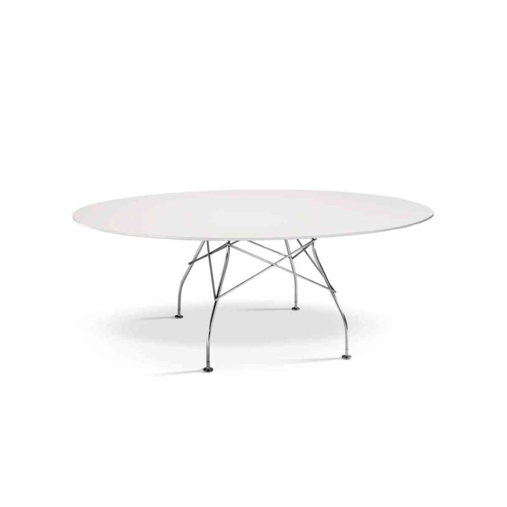 Nowe marmurowe wykończenie, które teraz otacza istniejące wersje w kolorze czarnym, białym i czerwonym, zwiększa atrakcyjność tej dobrze skonsolidowanej rodziny stołów, oferując idealne rozwiązania zarówno do wnętrz domowych, jak i biurowych, charakteryzujących się eleganckim i wyrafinowanym designem. Lekka konstrukcja z chromowanej stali, której wyróżniającą się cechą jest element krzyżowy łączący nogi z każdej z czterech stron, obsługuje blaty z różnych materiałów. Kolekcja jest interpretowana w kwadratowych, owalnych i okrągłych kształtach. Po prostu ustawiając je obok siebie, kwadratowe stoły można wykorzystać do stworzenia blatów roboczych do użytku w typowych kontekstach biurowych, takich jak sale konferencyjne.