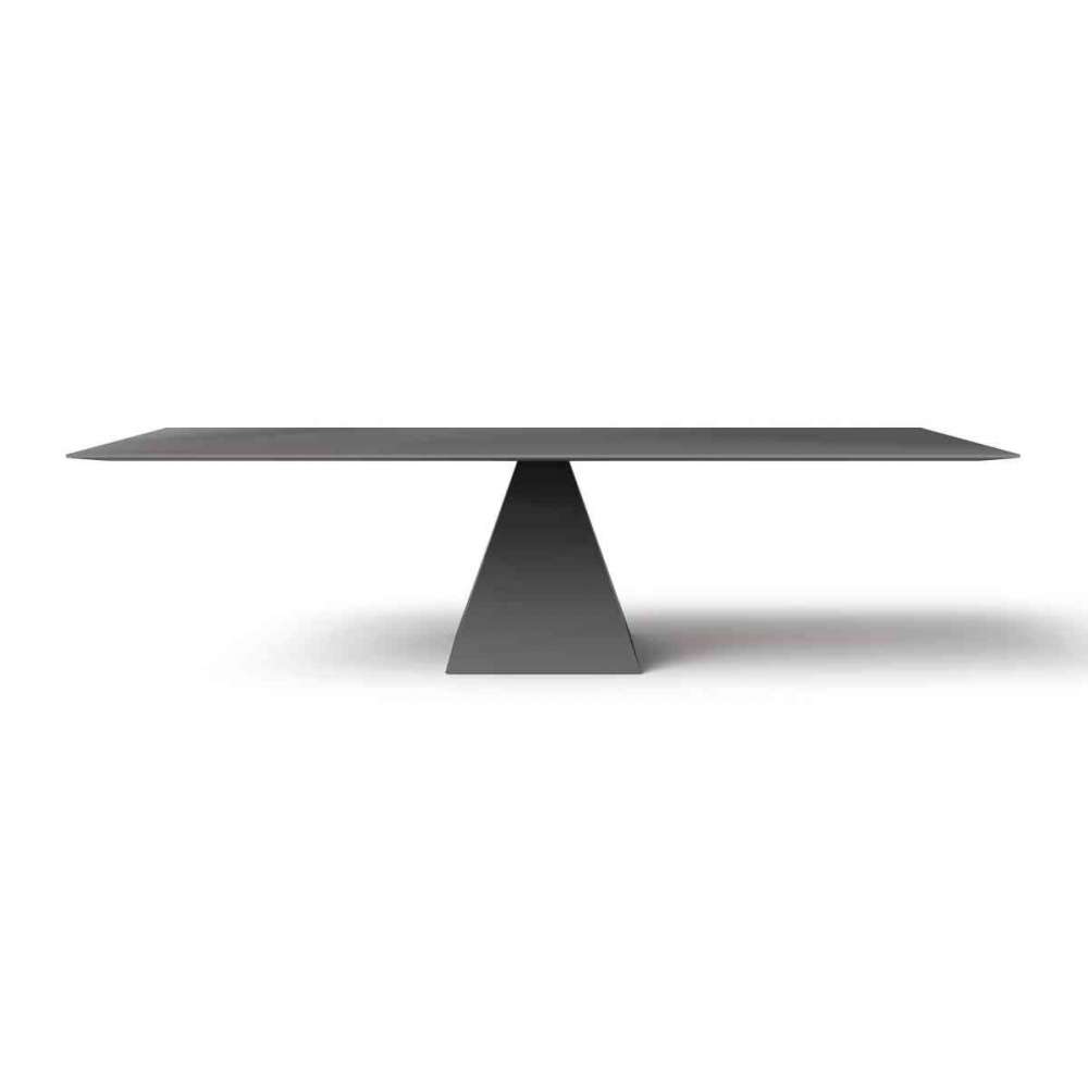 Kultowy stół Landing to kompozycyjna synteza lekkości i solidności. Poziomość dużego blatu spoczywa na czubku piramidalnej podstawy, w magicznej równowadze, która czyni go wyjątkowym dziełem w swoim rodzaju