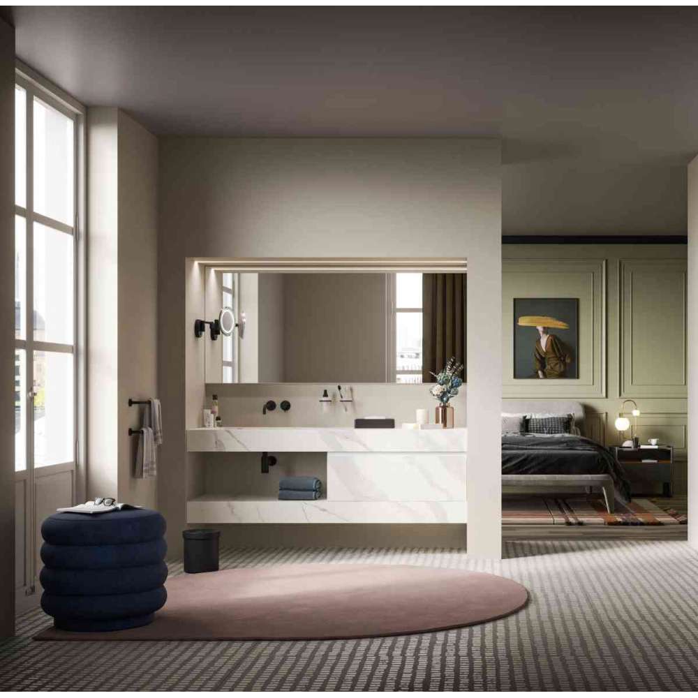 PERFETTO „GROOVE” charakteryzuje się zagłębionym otworem. Cienki profil metalowy, w wersji z anodowanego aluminium, zapewnia przyjemną estetykę górnej krawędzi frontu kabiny, zarówno w wersji z pełnym skrzydłem, jak i w wersji z ramą. Solidne fronty szafek dostępne są w wersji lakierowanej na połysk i mat oraz z drewnianymi lub teksturowanymi detalami dekoracyjnymi. Fronty szafek na ramkach aluminiowych satynowych (standard) lub aluminiowych białych lub czarnych (opcjonalnie) można łączyć w tej samej szafce lub uzupełniać inne szafki o pełnych skrzydłach. Centralne panele są oferowane ze szkła, HPL lub KAMIONKI PORCELANOWEJ, aby pasowały do blatu