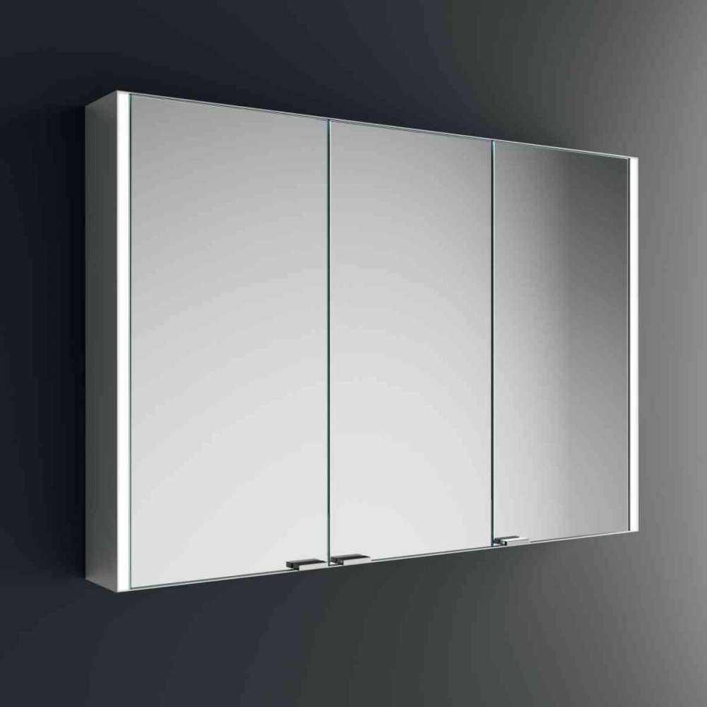 Szafka lustrzana z zewnętrznym oświetleniem LED z 2 stron, podwójnie lustrzane drzwi obrotowe 3+3mm, chromowane uchwyty, aluminiowy drążek wielofunkcyjny, 3 szklane półki z nieskończoną możliwością regulacji. Boki z anodyzowanego aluminium lub wykończenie do wyboru.