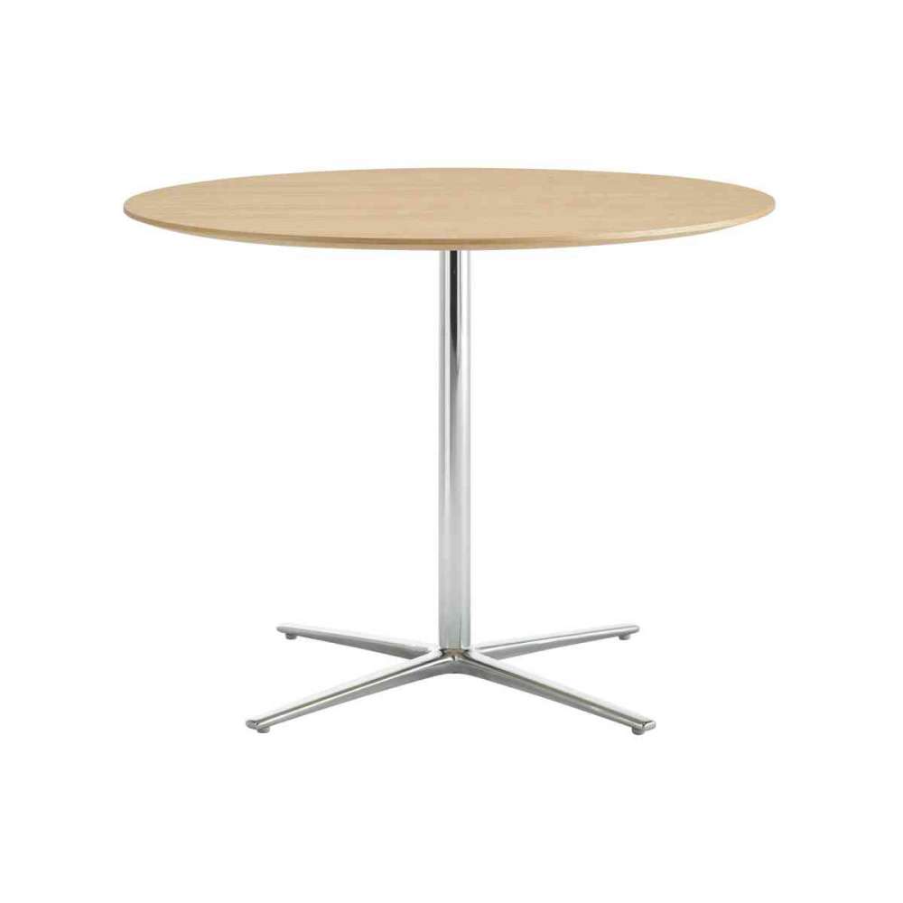 Stół o wysokości 75cm i Ø83cm z podstawą z polerowanego aluminium i blatem w kolorze dębu.