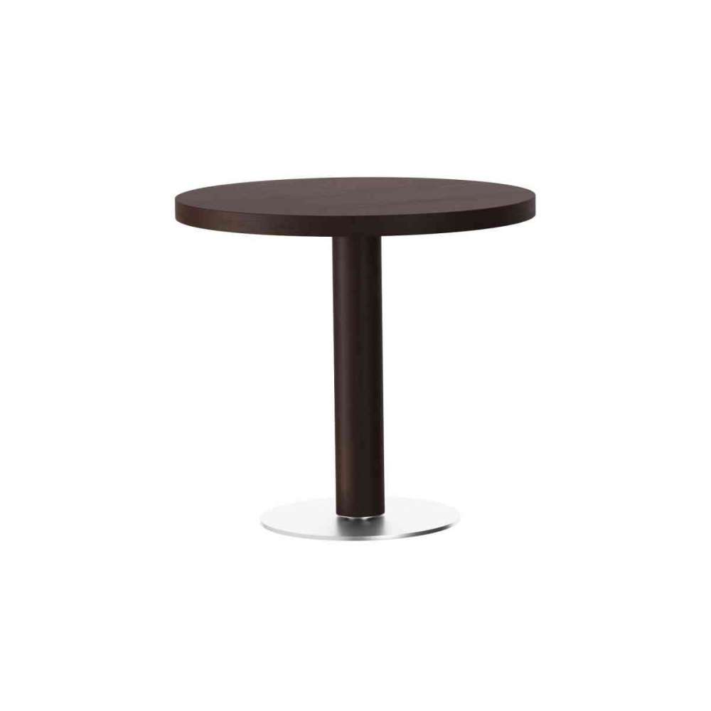 Stół ze słupem z masywnego drewna Ø11cm, podstawą słupa i kwadratową płytą podstawy stal nierdzewna polerowana, blat fornirowany, krawędź typu G, grubość 50mm