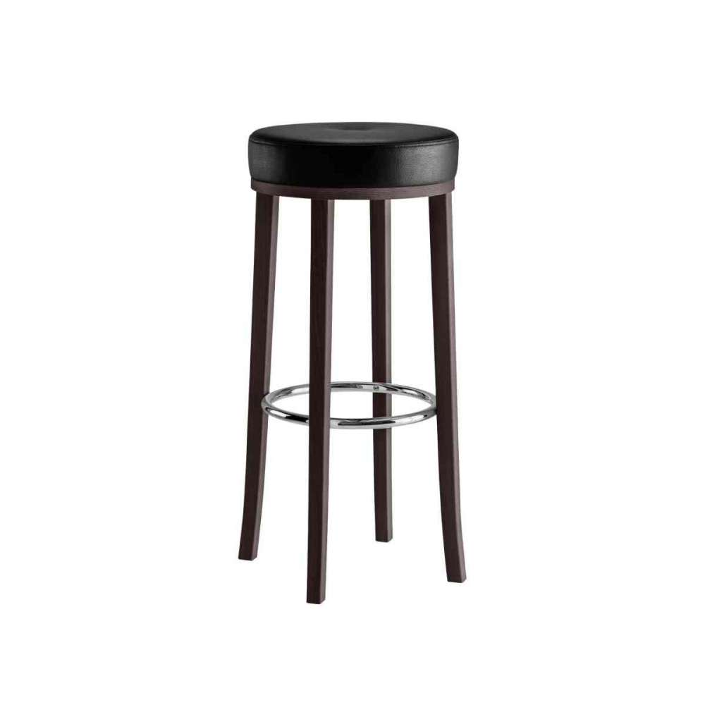 Stołek barowy, siedzisko tapicerowane, rama siedziska i nogi z litego drewna giętego, pierścień na nogę chromowany pierścień na nogę