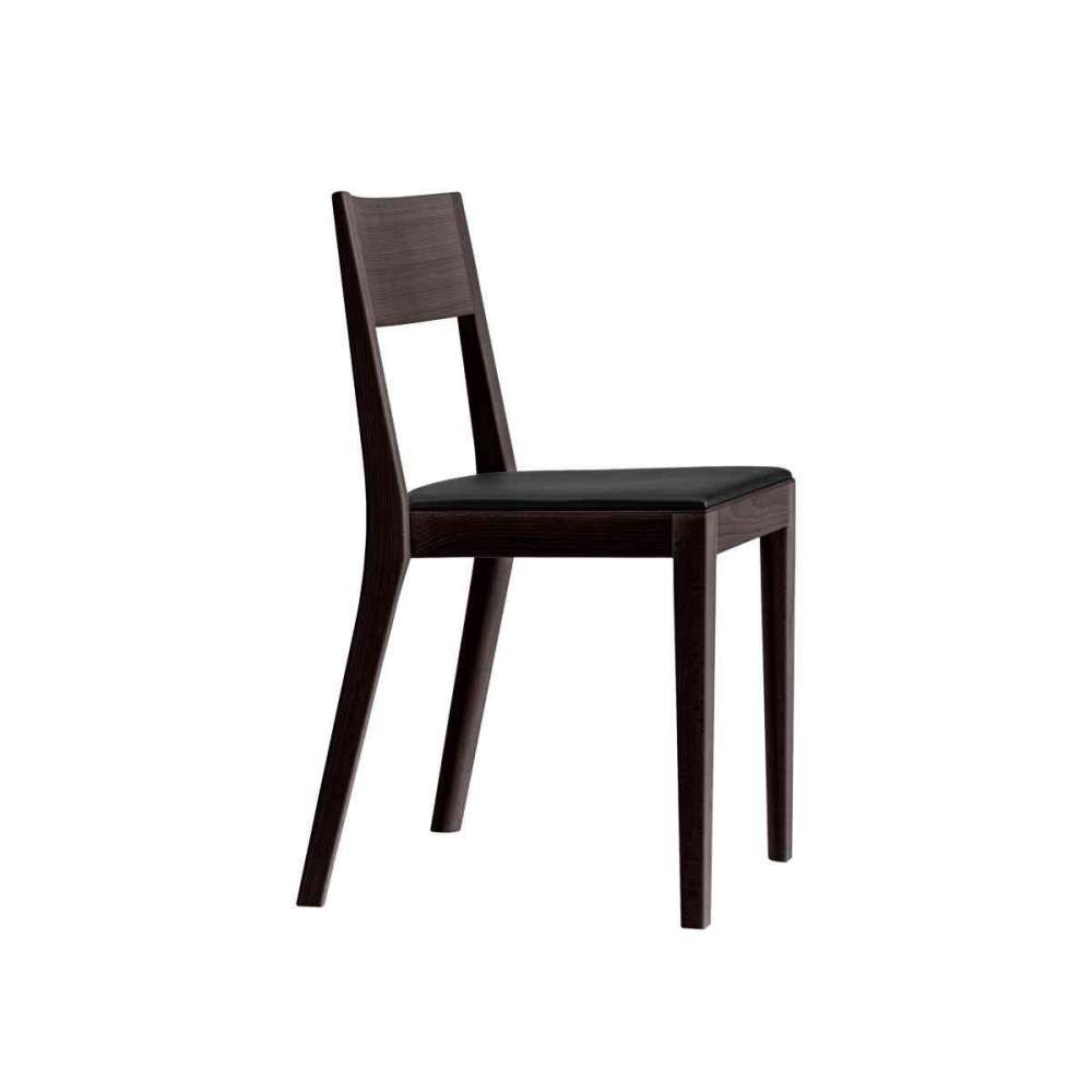 Tapicerowane siedzisko, tylne nogi i oparcie z litego drewna giętego, możliwość sztaplowania, opcjonalnie łącznik rzędów