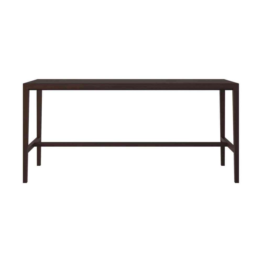 szczególnie przy ciemnych plamach wzór się wyróżnia. Brak spoin, nic nie odwraca uwagi od harmonii drewna w tym monolitycznym stole. Elegancki puryzm, który wymaga bardzo precyzyjnego wykonania. Blat o grubości 25 mm jest produkowany specjalnie dla mih ze sklejki bukowej, aby sprostać wysokim wymaganiom płaskości blatu nawet bez inkrustacji. Składa się z obciążników i podpór jak sklepienie. Opierając się na oryginalnym projekcie mi iw celu zachowania wyrazu architektonicznego, projektanci narysowali bardzo lekko zwężające się nogi. To nadaje im prosty wygląd. Nogi są starannie przykręcone do blatu. Centralna siatka łączy nogi stołu biegnące równolegle do blatu. Czy to jako stół stojący, czy w towarzystwie hokerów mih nadaje się nie tylko do domu, ale również do obiektu i powierzchni biurowej.
