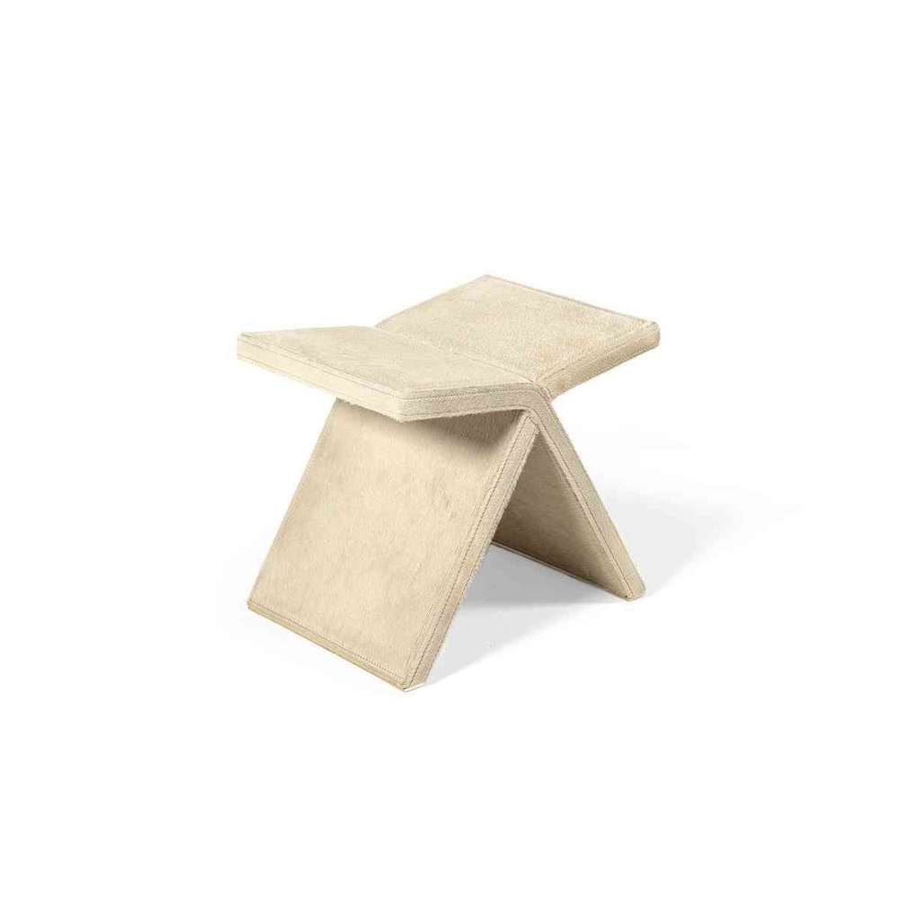 Pufa Voyage jest dostępna tylko ze skórą bydlęcą o wyglądzie kucyka i ma design przypominający stołek ogrodowy. Pufa charakteryzuje się dwoma zakrzywionymi elementami, które łączą się na siedzisku.