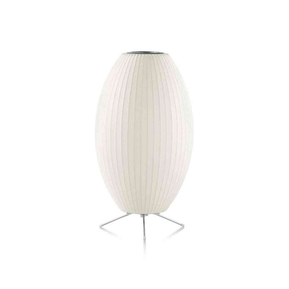Będąca częścią serii Nelson Bubble Lamp, Nelson Cigar Lamp Tripod ma zaokrąglony kształt z czystymi równoległymi liniami podkreślającymi jej wydłużoną kulę.