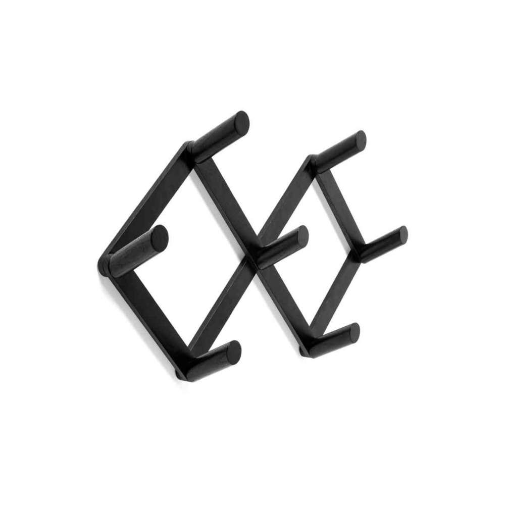 Wieszak w kształcie rombu z gładkimi okrągłymi drążkami do wieszania płaszczy. Wykonany z jesionu, z możliwością wyboru wykończenia olejowanego lub malowanego na czarno.