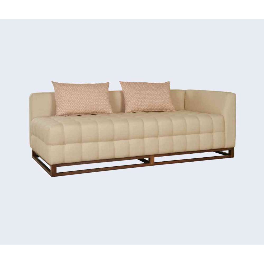 Sofa ma podstawę jesionową z głębokim tapicerowanym siedziskiem i detalami pikowania. Pochylona konstrukcja oparcia i podłokietników jest wykończona dodatkowymi poduszkami rozproszonymi Sofa z podłokietnikiem i środkiem