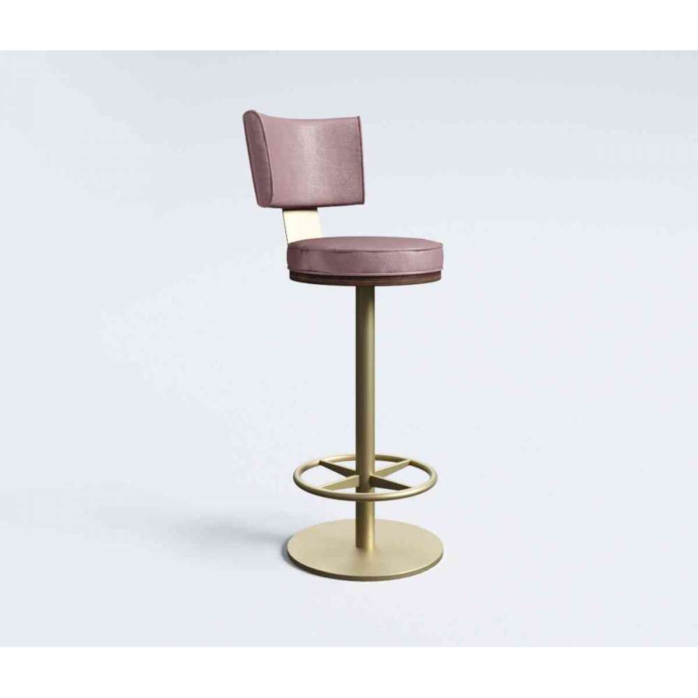 Ten elegancki stołek barowy doda odrobinę blasku każdemu wnętrzu, które zdobi , Jesionowa podstawa siedziska z okrągłą tapicerowaną nakładką siedziska. Zakrzywiona tapicerowana poduszka oparcia jest wsparta na ukształtowanej mosiężnej płycie z odsłoniętymi mocowaniami
