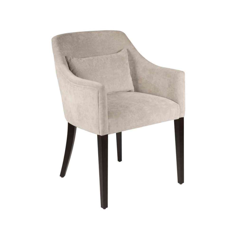 To wszechstronne krzesło zawiera jedną poduszkę 20x40 i ma konstrukcję z litego drewna oraz nogi w wykończeniu Espresso. Inne wykończenia są dostępne na życzenie. Jest dostępny w tkaninach i skórach kat. I-VI (2,2m/szt.) i jest możliwy w materiale własnym klienta.