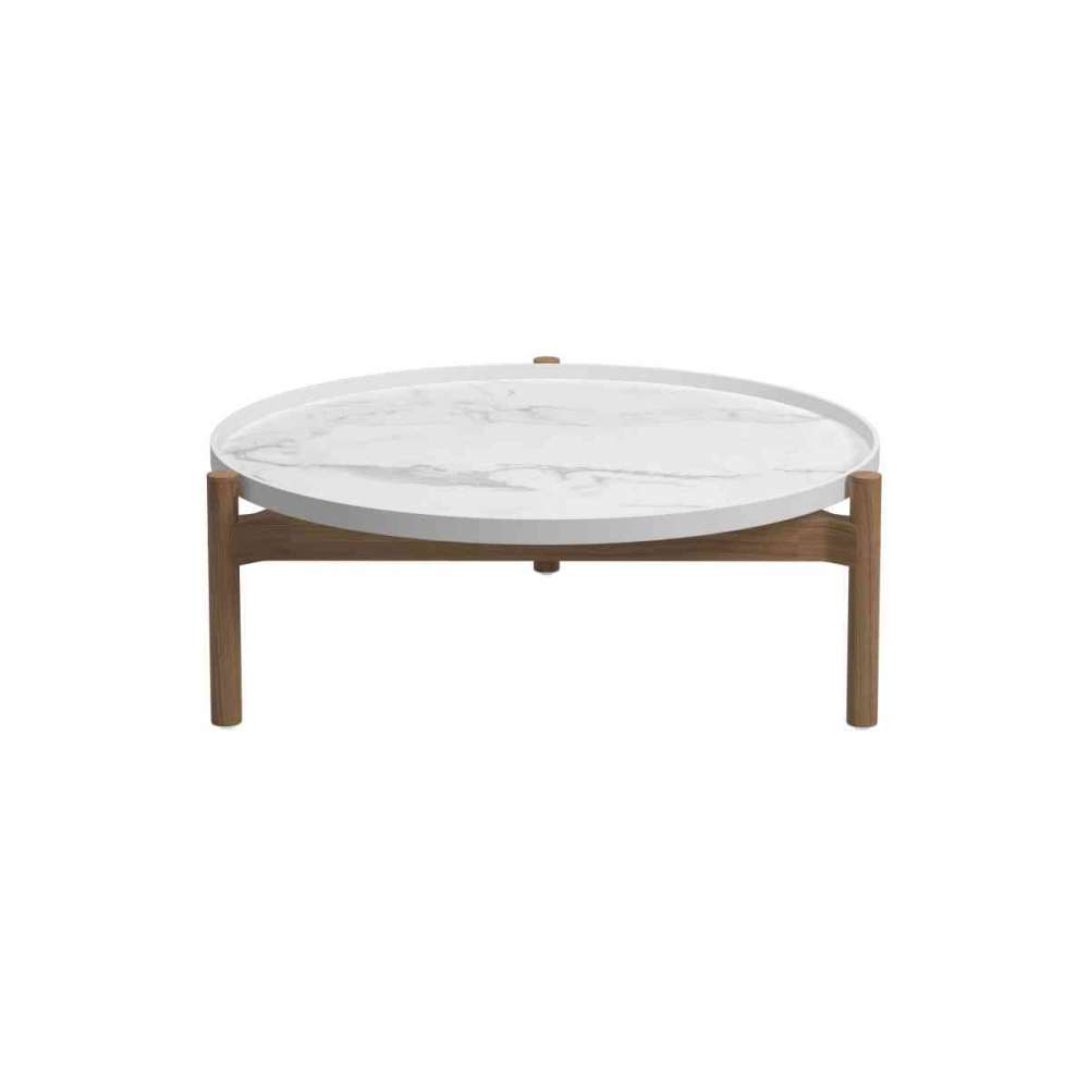 Każdy stół składa się z ceramicznego blatu, obramowanego proszkowo aluminium, wspartego na prostej, ale pięknie wykończonej, równobocznej ramie z drewna tekowego. Dostępna w wykończeniach Bianco (blat ceramiczny z efektem białego marmuru z krawędzią aluminiową malowaną proszkowo na biało), Nero (blat ceramiczny z efektem czarnego marmuru z krawędzią aluminiową malowaną proszkowo metodą Meteor) lub Emperor (blat ceramiczny z efektem brązowego marmuru z krawędzią malowaną proszkowo Java), ta czysta paleta i prosta forma zapewniają uniwersalność. Dobrze pasujące do szerokiej gamy kolekcji Gloster, o odpowiednio 61 cm i 87 cm średnicy oraz 41 cm wysokości i 31 cm wysokości, stolik boczny i stolik kawowy zostały zaprojektowane tak, aby zachodziły na siebie, gdy są używane razem w hołdzie ich kwiatowym wpływom.