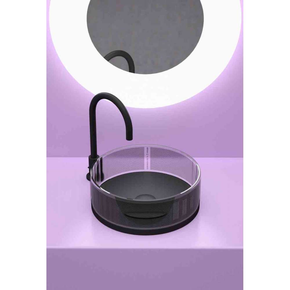 Umywalka nablatowa wykonana z kryształu. Radykalny sitodruk jest dziełem słynnego projektanta Ettore Sottsass.
