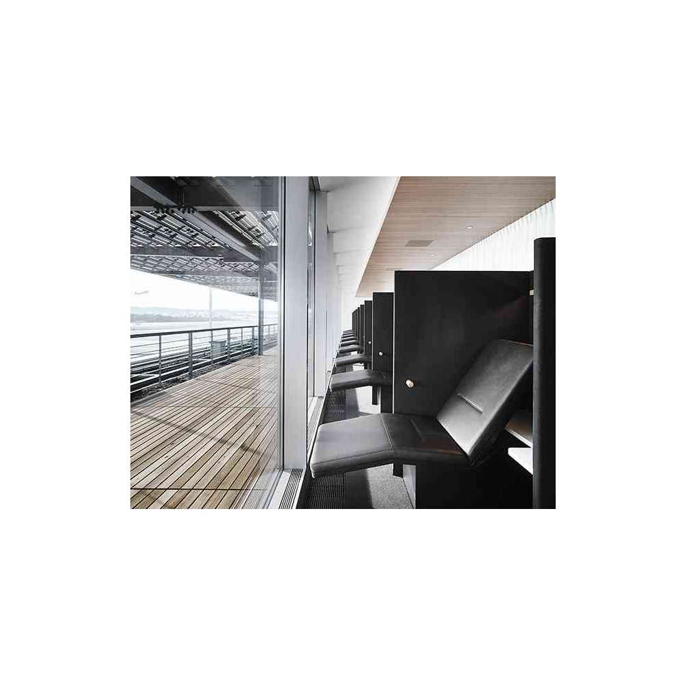 Greutmann Bolzern zaprojektował innowacyjną wielostrefową koncepcję ze specjalnymi meblami do poczekalni SWISS w doku E na lotnisku w Zurychu. Oprócz szeregu ławek, we współpracy z Girsberger wyprodukowano również 19 leżaków, które można odchylać od pozycji pionowej do czytania do pozycji poziomej. Kluczowe wyzwanie projektowe polegało na opracowaniu płynnego mechanizmu obrotowego, który łagodnie zatrzymywałby się w obu pozycjach. Za pomocą prototypów proces odchylania był wielokrotnie optymalizowany i udoskonalany. Przegrody w kształcie litery U, które otaczają każdy rozkładany leżak, zapewniają prywatność i ochronę przed otaczającym hałasem, ale są również wyposażone w zintegrowane okablowanie elektryczne z lampką do czytania i gniazdami zasilającymi do ładowania akumulatorów.