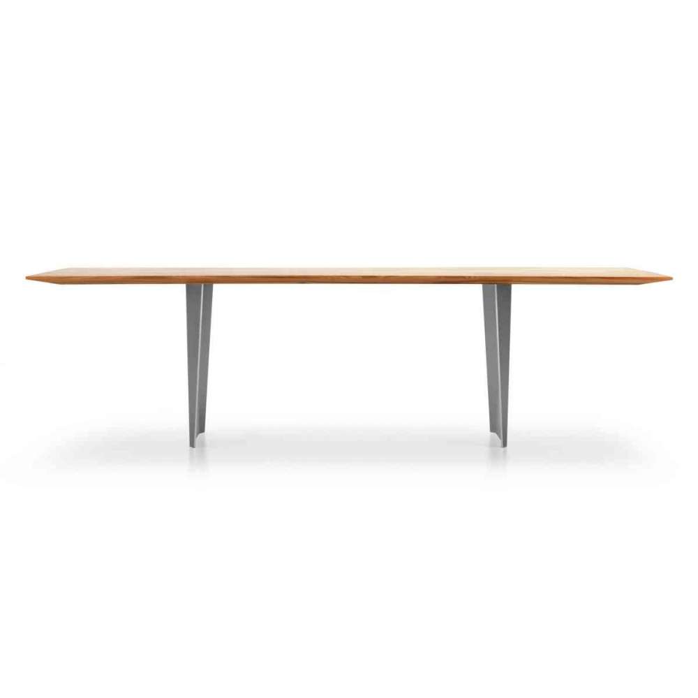 Der Tisch Onda wartet mit drei Besonderheiten auf. Blickfang sind die markanten, abgekanteten Stahlwangen, die dem Tisch Ausdruck und Stand verleihen. Daneben fall die Bootsform des Tischblatts und die wellenförmige Kontur seiner Kante auf.