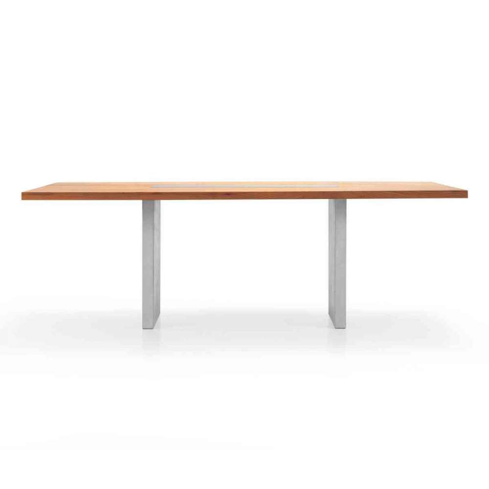Zwei Bretter aus dem herznahen Holz eines Baumstamms und eine Einlage aus Edelstahl bilden die Tischplatte von Nur, die auf zwei schlichten Betonsockeln ruht. Der neue Tisch zeigt die Kompetenz von Girsberger in der Beschaffung und Verarbeitung von Massivholz.
