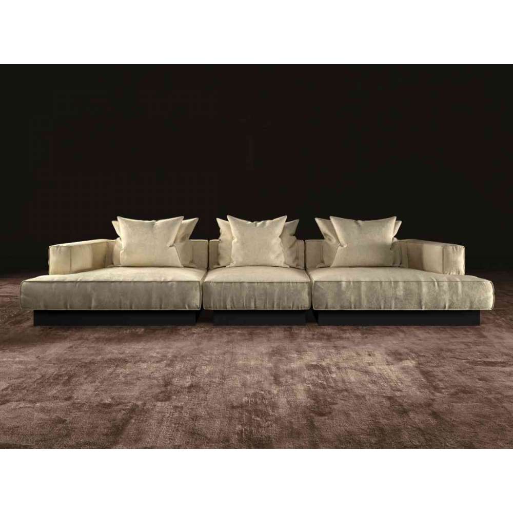 MOONAGE DAYDREAM to sofa modułowa. Konfiguracji można dokonać wybierając spośród czterech elementów: modułu centralnego, modułu końcowego, modułu końcowego szerokiego oraz szezlonga. Każdy element składa się z drewnianej skorupy wyściełanej pianką poliuretanową o różnej gęstości, wykończonej wierzchnią warstwą włókna akrylowego. W skład każdego modułu wchodzi poduszka oparcia oraz druga poduszka 60x60 cm. Moonage Daydream jest dostępny w całości pokrytej tkaniną lub skórą. Podstawa wykonana z matowego czarnego lakierowanego drewna lub pokryta metalową obudową w wykończeniach z polerowanego mosiądzu i polerowanej stali.