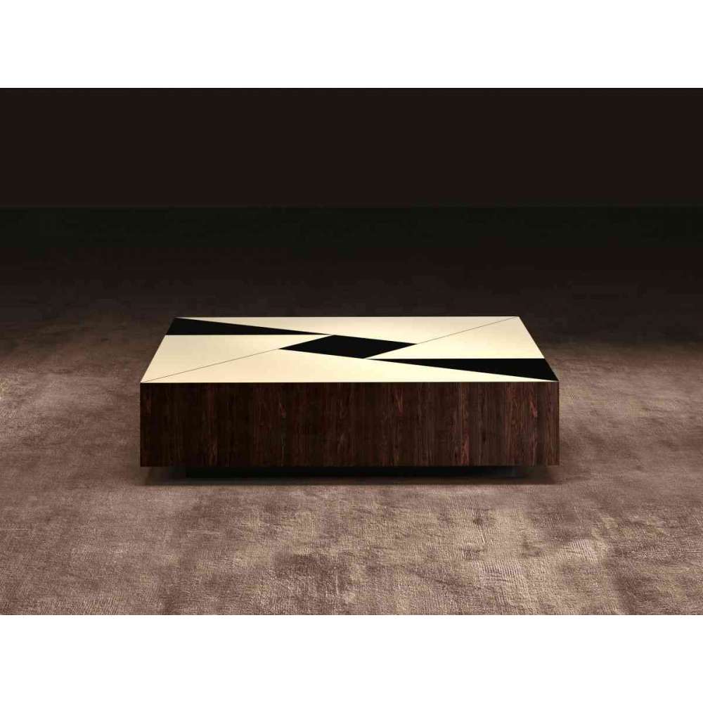 Stolik kawowy Essence Low wykonany jest z drewna. Blat ma błyszczącą lakierowaną grafikę w kolorze czarnym i kości słoniowej, boczne powierzchnie są fornirowane błyszczącym lakierowanym drewnem Louro Preto. Dopełnieniem produktu jest podstawa w kolorze popiołu pomalowanego na czarny mat z otwartymi porami.