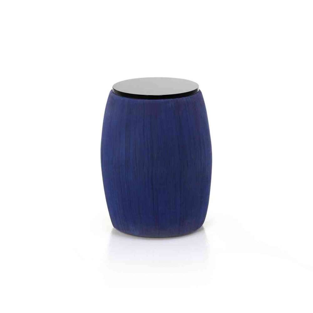 Stolik / pufa wykonana z papieru gazetowego, prasowanego i lakierowanego na niebiesko. Blat z płyty MDF, lakierowanej na czarny połysk.