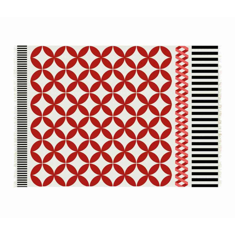 „Tradycyjny kilim o innowacyjnym, współczesnym designie. Ten żywy, kolorowy geometryczny kilim przywołuje na myśl czerwone wino, jesienne zbiory nad morzem i zapach kwiatów. Szereg bordiur i girland ozdobi Twój dom orientalnymi smakami i wulkanicznymi kolorami. Nowoczesność i tradycja gobelinu jednocześnie intensywnego i delikatnego.”