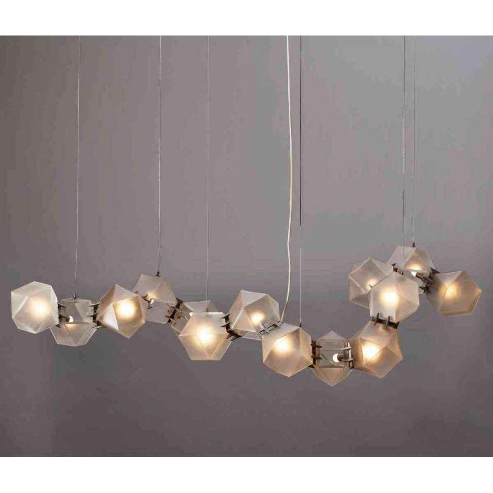 Każdy jedyny w swoim rodzaju szklany element jest dmuchany, aby wygenerować kształt przypominający klejnot i stworzyć jasne, rozproszone światło . Polerowane elementy przypominające zęby odważnie podtrzymują każdą szklaną objętość i utrzymują bryłę ogólnej organicznej sylwetki. ręcznie robiona biżuteria, te wykwintne elementy są dostępne w szkle dymno-szarym, alabastrowo-białym i kalifornijsko-różowym. ciało, a następnie fachowo wypolerowane i ukształtowane do jego rozpoznawalnej formy.