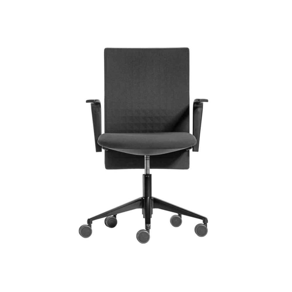 Obrotowe na aluminiowej podstawie z 5 ostrogami, regulacja wysokości, mechanizm synchroniczny wrażliwy na ciężar, z ramieniem, dźwiękochłonne oparcie. Kluczową cechą kolekcji Elodie jest zupełnie nowe, dźwiękochłonne oparcie. Dzięki trzem wysokościom oparcia i dyskretnie zintegrowanemu mechanizmowi synchronizacji, wszechstronność tej rodziny sprawia, że idealnie nadaje się do stanowisk kierowniczych i kierowniczych.