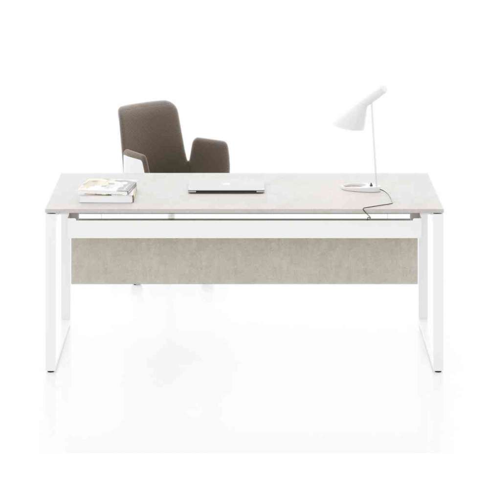 Konstrukcja biurka wykonana jest z rury stalowej o przekroju prostokątnym (45 mm x 20 mm), giętej i spawanej, tworząc pionowe słupki nogi i belki dolnej. Słupki są następnie łączone ze sobą przez górną belkę o przekroju kwadratowym (45×45 mm), uzyskując typowy zamknięty kształt, który charakteryzuje tę kolekcję. Konstrukcja jest dostępna w wykończeniu białym, aluminiowym i czarnym i może być zintegrowana z melaminowym panelem zamykającym, aby zagwarantować prywatność.