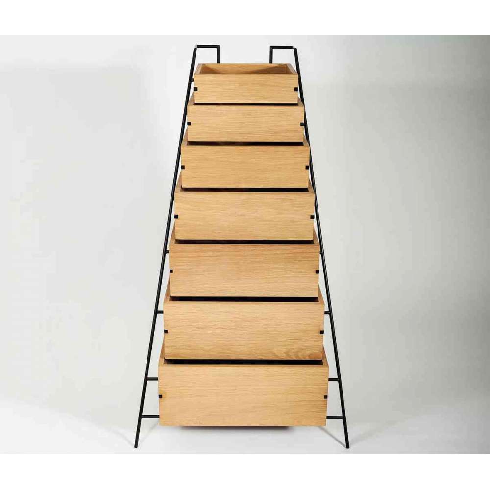 Opiera się na dyskretnej stalowej ramie połączonej z drewnianymi szufladami z masywnego dębu, które można ustawiać jeden na drugim.